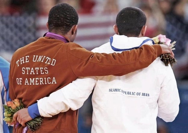 Wrestlers Jordan Ernest Burroughs of the U.S. and Iran’s Sadegh Saeed Goudarzi on the medal podium at the London Olympics in 2012 (©Reuters)