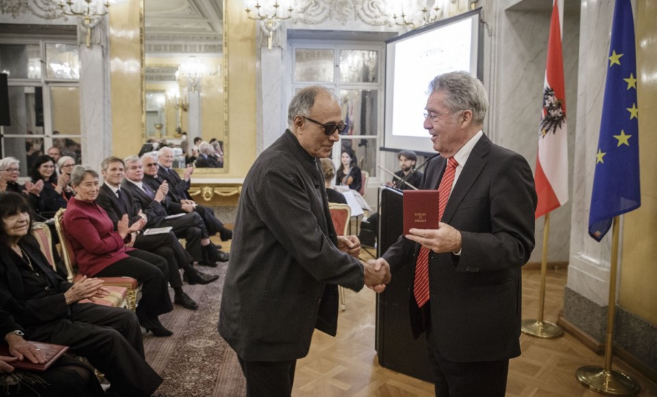 Iranian film director Abbas Kiarostami receiving his Cross of Honor from Austria’s President Heinz Fischer – Photo credit: Peter Lechner/HBF