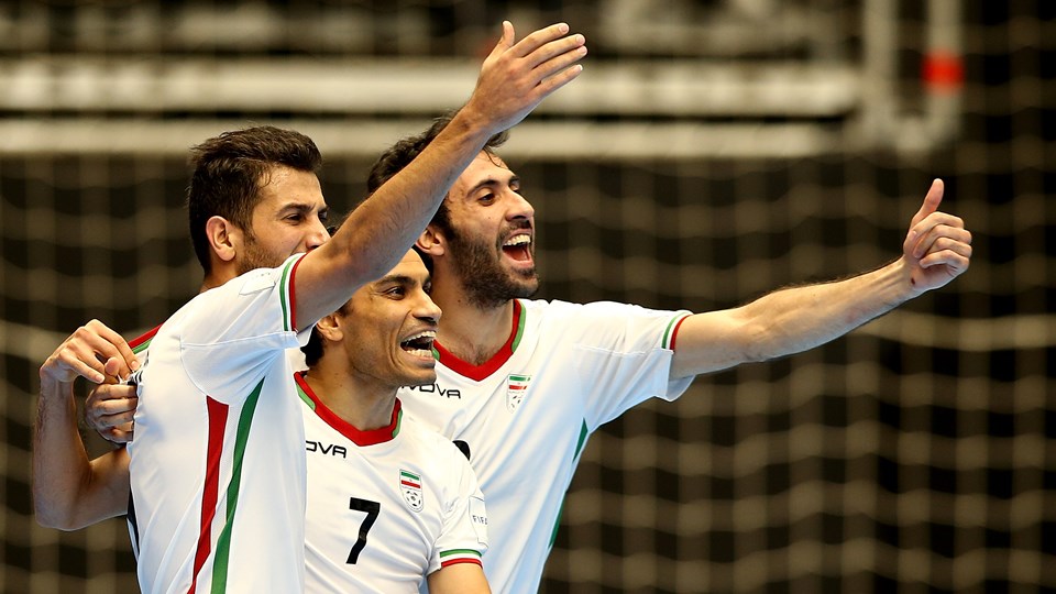 Ali Hassan Zadeh of Iran (C) celebrates his goal with team mates during the semi-final match between Iran and Russia at the FIFA Futsal World Cup in Colombia. (Photo by Jan Kruger – FIFA via Getty Images)
