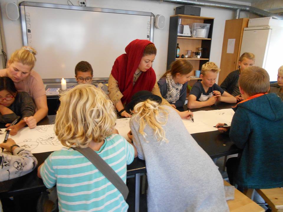 The workshops based on two stories by Hoda Hadadi -The mountain that wants to go somewhere else & The shrimp and the mermaid, translated to Danish by poet and publisher Shekufe Tadayoni Heiberg. The students learned mix techniques: linocut from Ali Boozari and collage by Hoda Hadadi. Organized by Selskabet for Børnelitteratur, IBBY Denmark. March/April 2017. Photo credit Hoda Hadadi, facebook.com @hodihadadi